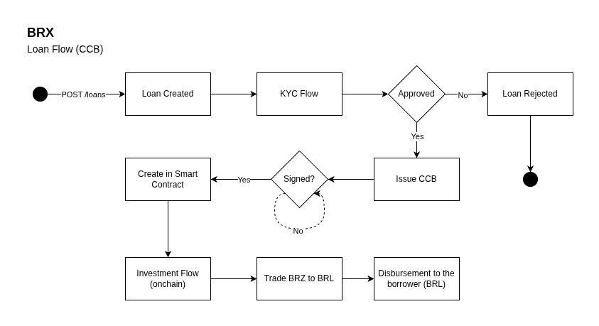 The process starts when a loan is created (e.g. via POST /loans). Depending on the facility, the loan goes through KYC and approval. Once approved, the CCB is issued and must be signed by the required parties. After all signatures are collected, the loan is created in the smart contract and enters the on-chain investment flow. Funds are then converted from BRZ to BRL and disbursed to the borrower’s account.